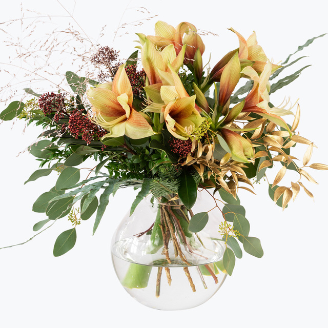 Delikat bukett med flotte amaryllis som blikkfang. En nydelig blomsterhilsen til den du vil vise omtanke.